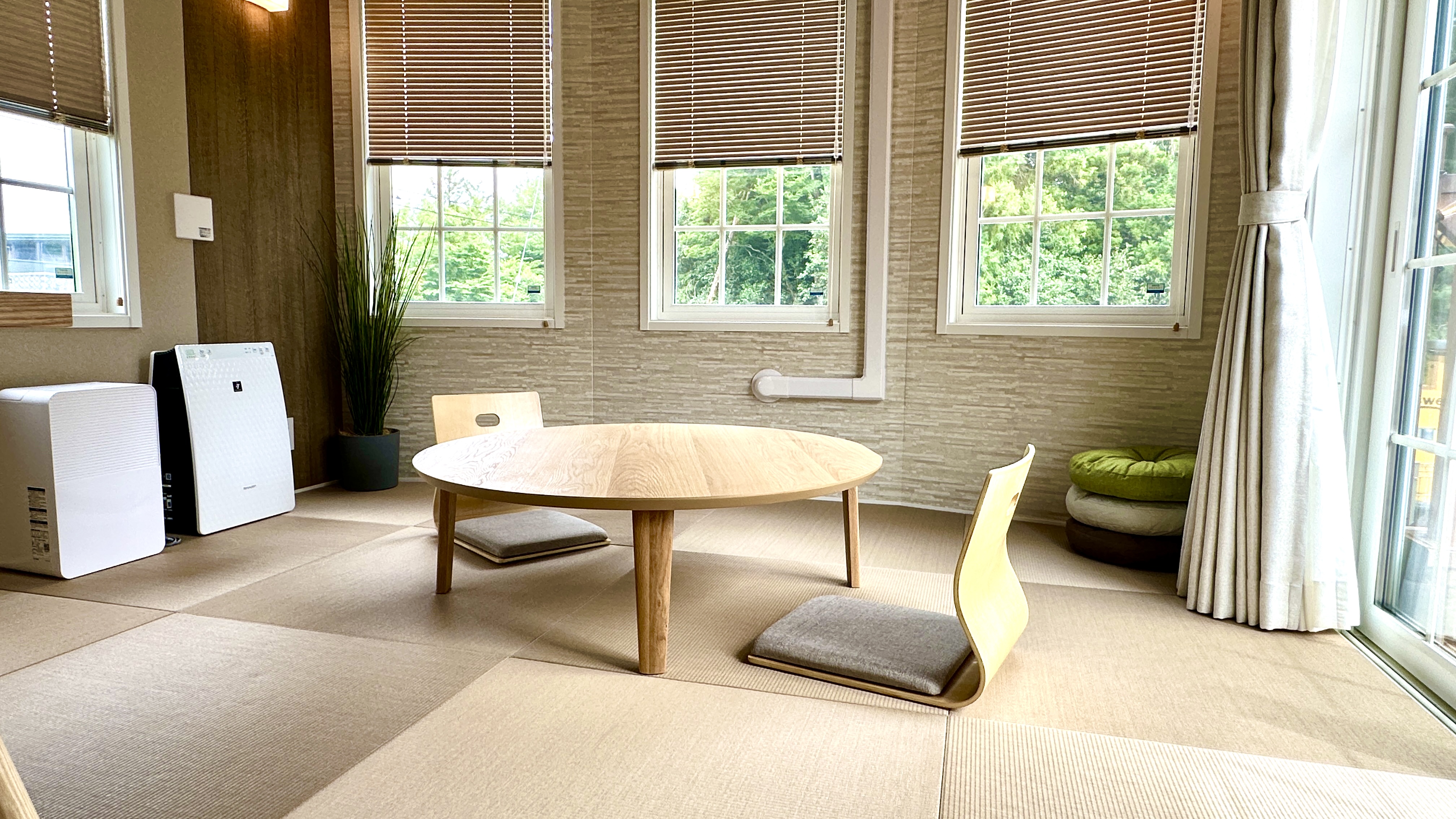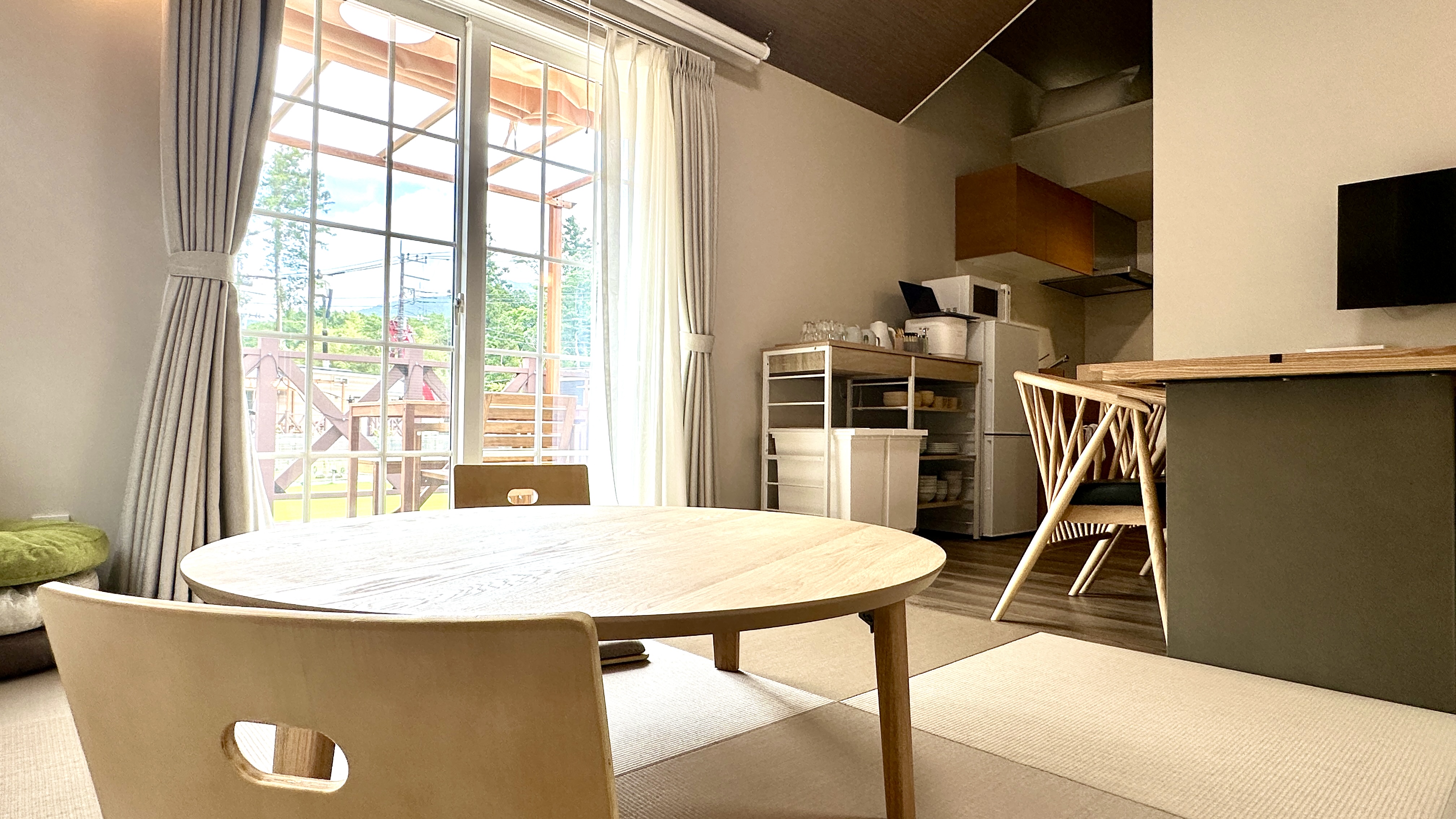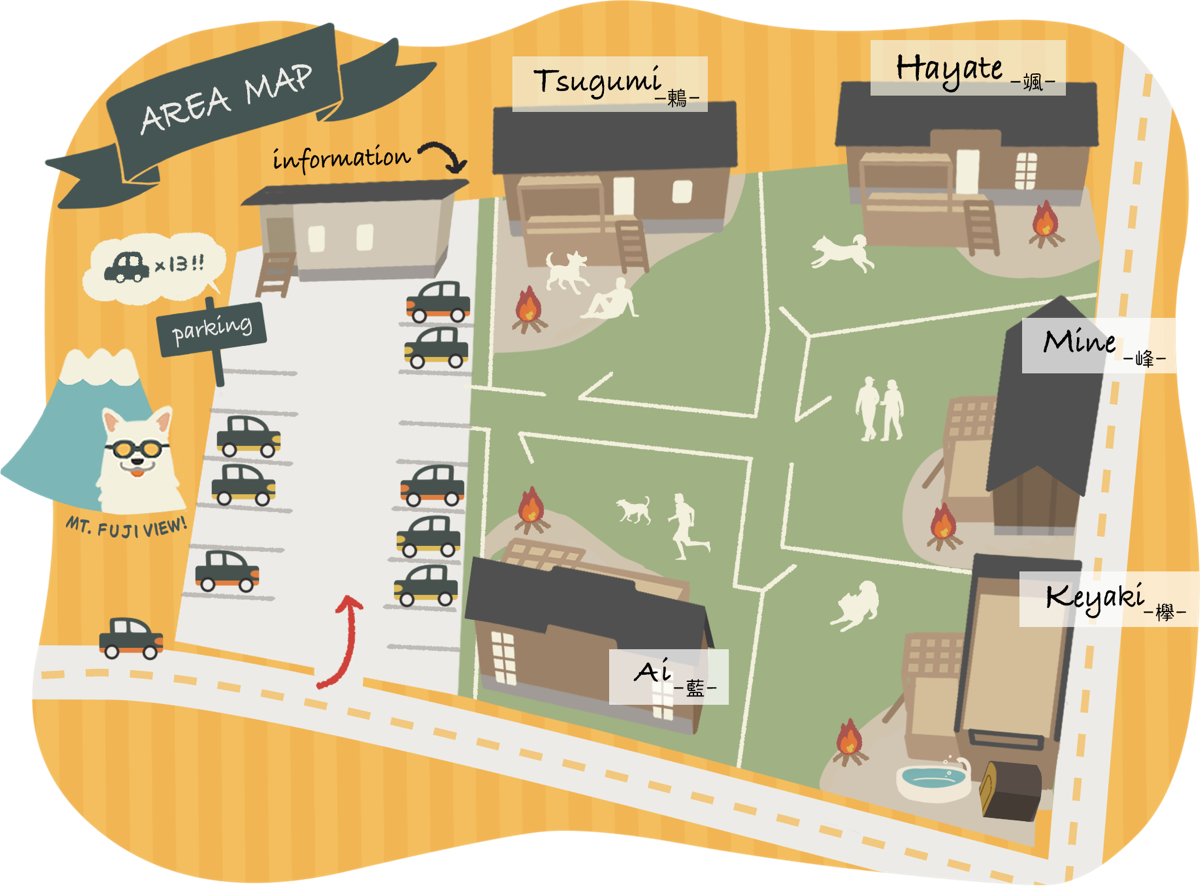 富士山の麓に広がる穏やかで落ち着きのあるテイストのお部屋となっております。 5棟の中で1番広いドックラン付きのため、多頭飼いのお客様におすすめの一室です。