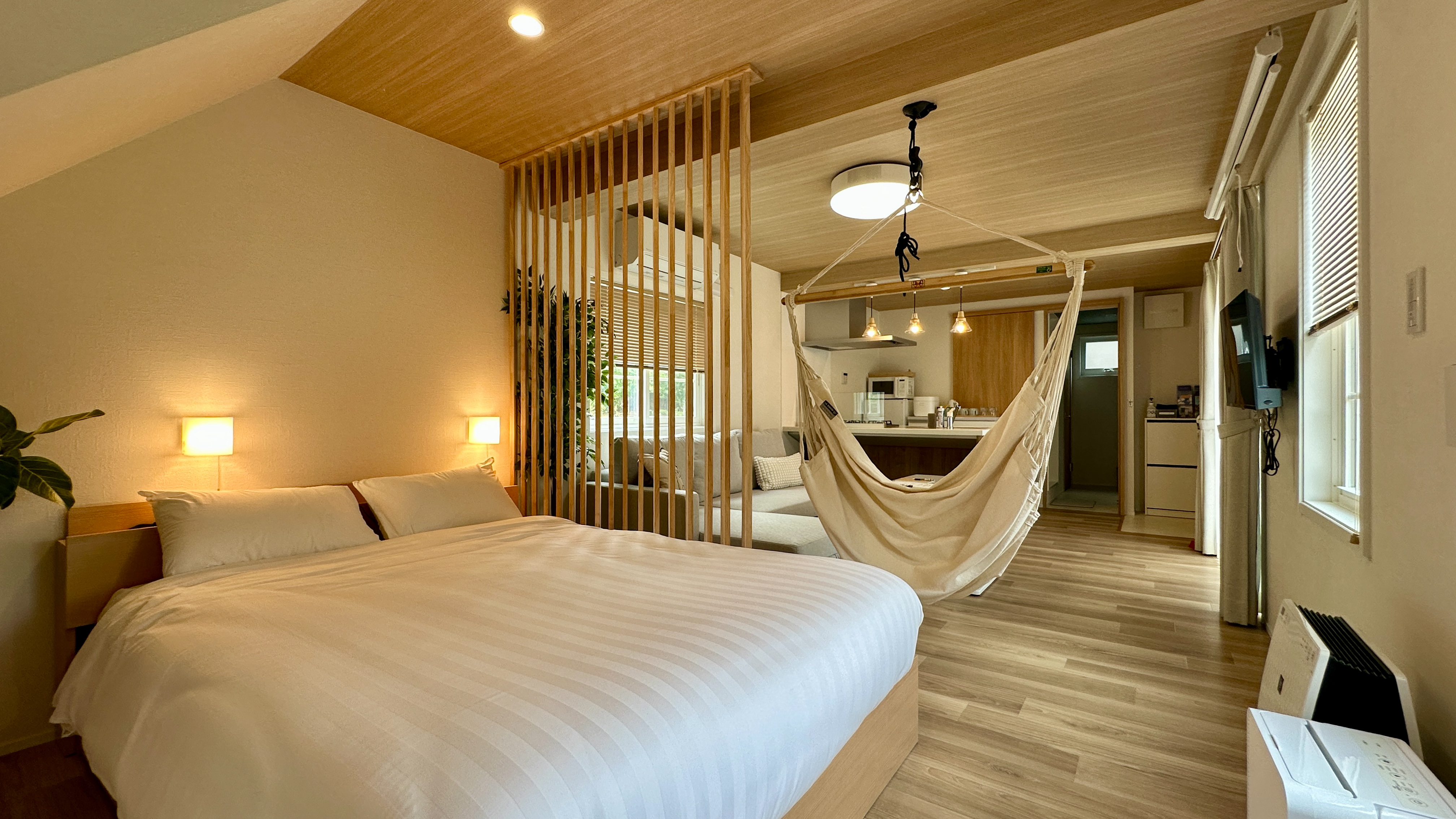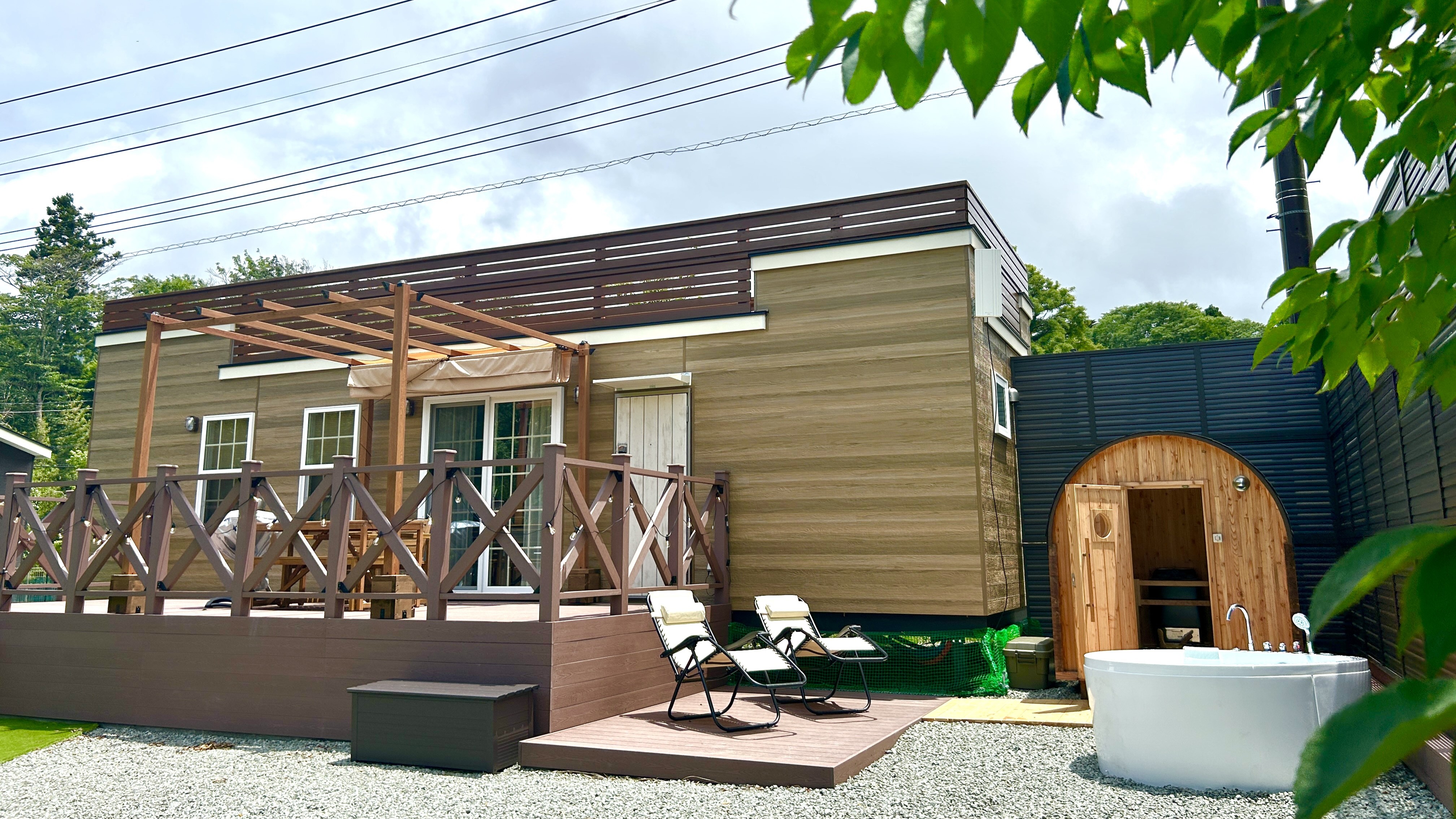 富士山の麓に息づく欅から着想を得た「欅」は、自然の美しさと温もりを感じる落ち着いたお部屋です。ハンモックに揺られながら、ゆったりとした時間を。バレルサウナとジャグジーをご用意しており、心身ともにリフレッシュいただけます。※ 水着の持参をお願いしております。