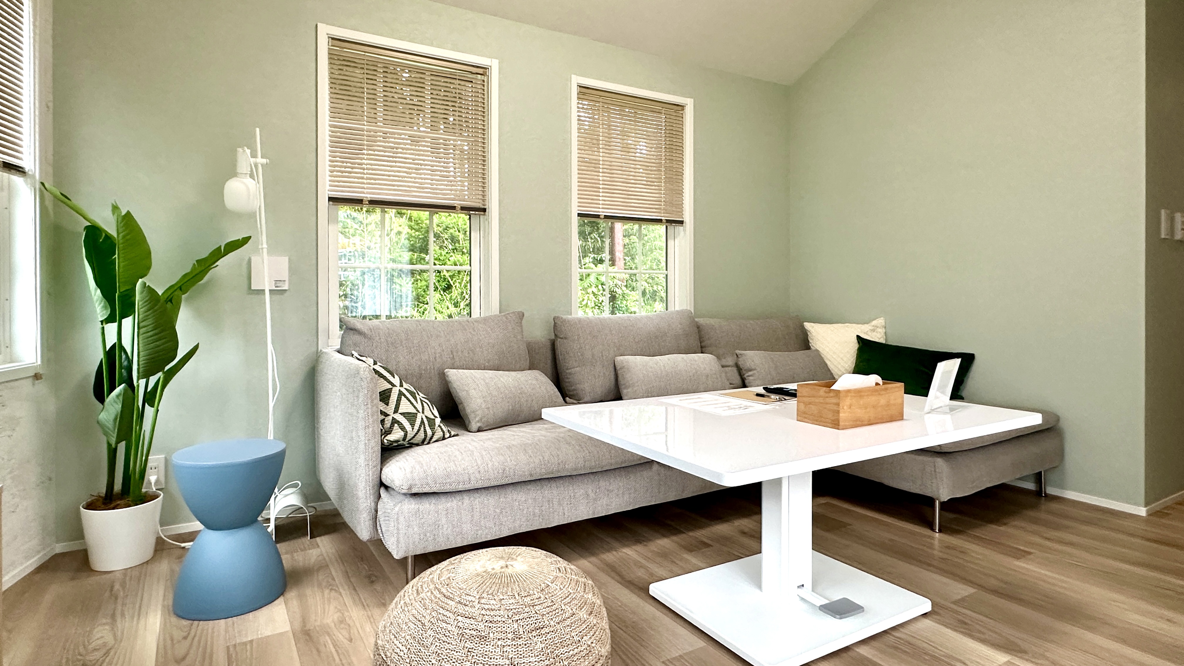 風が駆け抜けるような爽やかさに包まれた空間でお客様にリフレッシュして頂きたい、そんな思いで名付けた「颯」。大きなソファでゆったりできるグリーンを基調としたお部屋となっております。