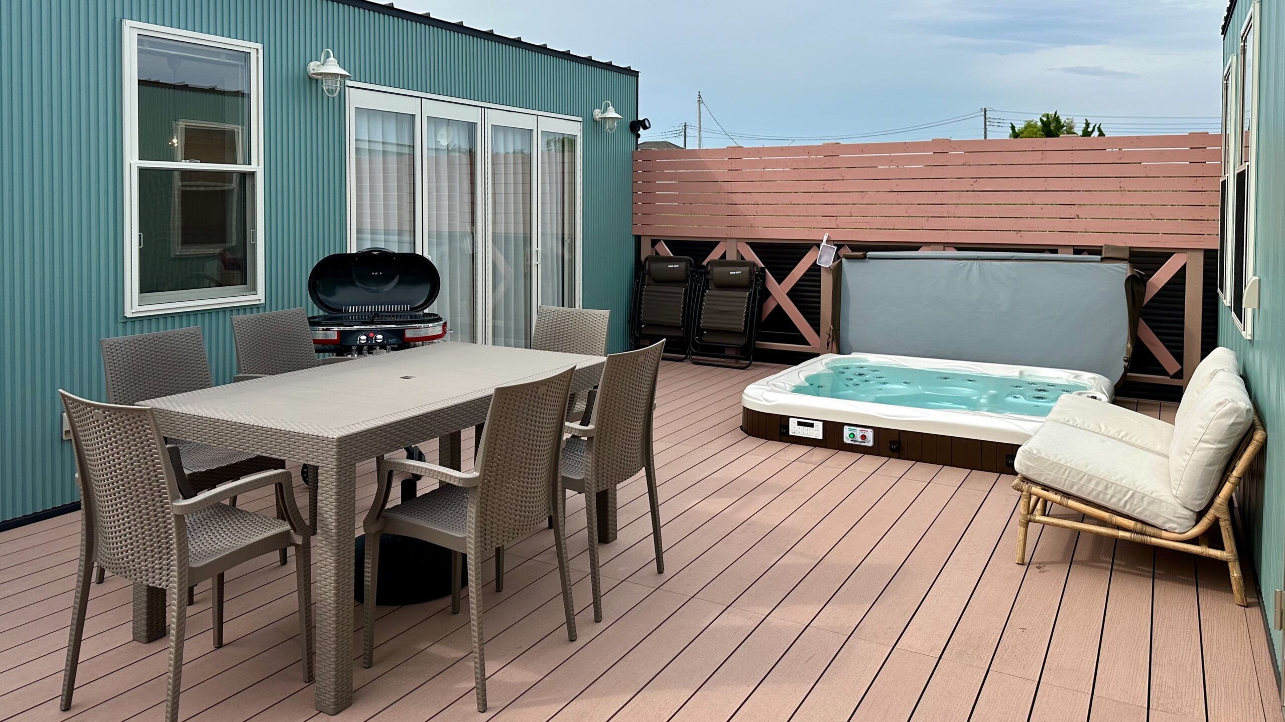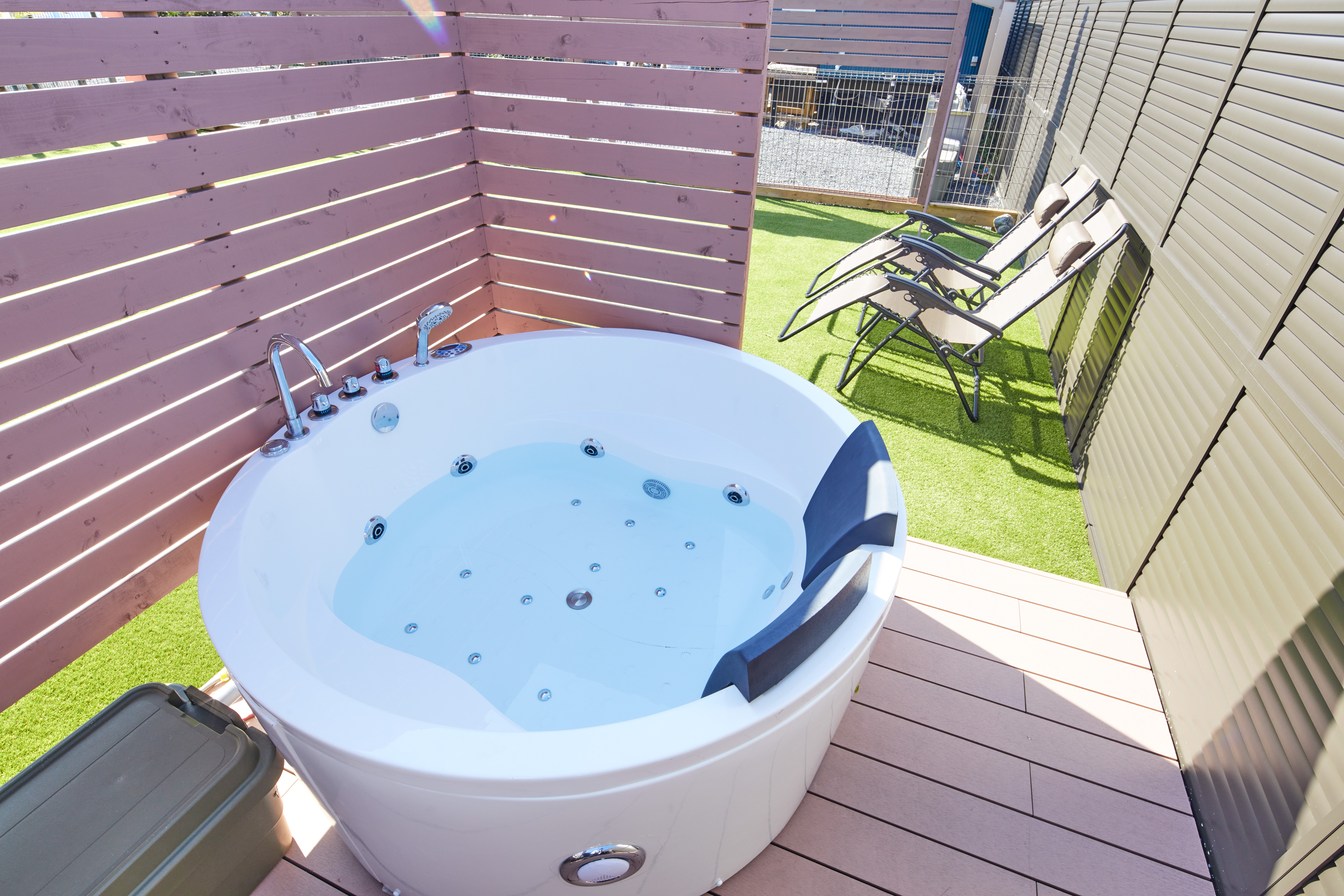 ホワイト×ラタンが特徴の爽やかなお部屋 グループでの旅行に最適です。 4名用のバレルサウナとジャグジーが付いています。 水着の持参をお願いしております。