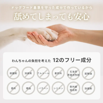 わんちゃんが身体を舐めてしまっても害や刺激にならないように、舐めても問題ないスキンケア商品をつくりました。ドッグフードの成分基準をクリアした成分のみで製造し、安心して使い続けやすい設計にしています。